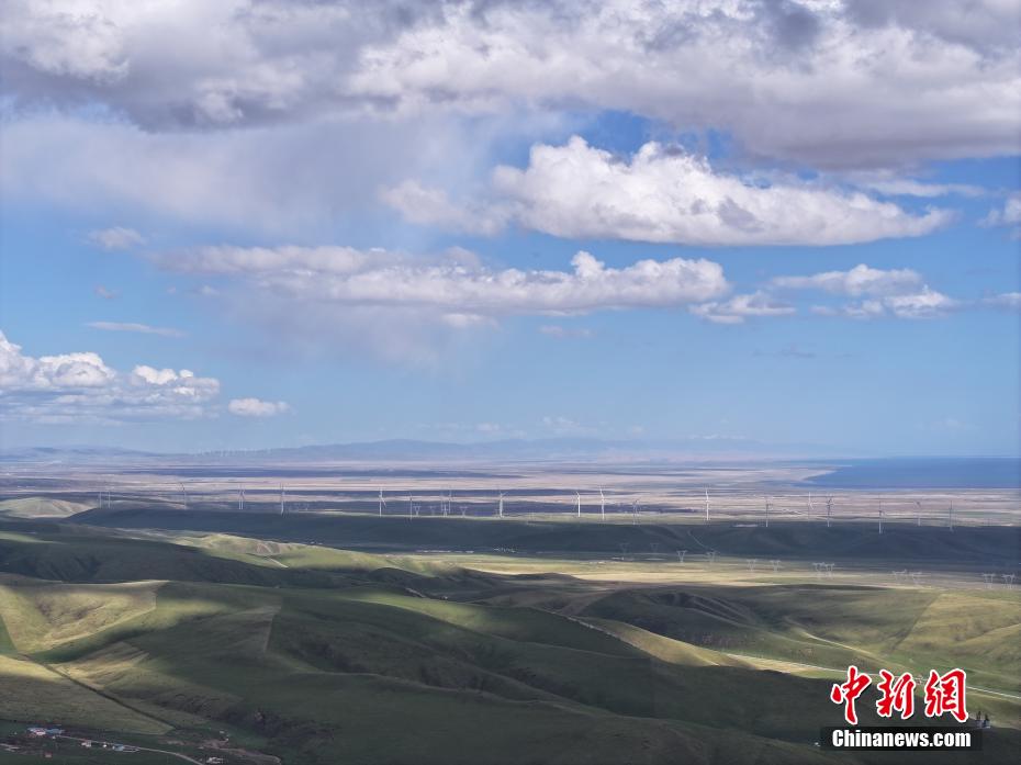 6月4日,航拍青海省海北藏族自治州剛察縣夏日草原秀美風(fēng)光。地處青海湖北岸的剛察縣,被稱作“海濱藏城”,夏日,連綿的草原綠草萋萋,成群牛羊在山間覓食,遠(yuǎn)處的青海湖水天一色,若隱若現(xiàn),風(fēng)光秀美。(無人機(jī)照片)馬銘言 攝