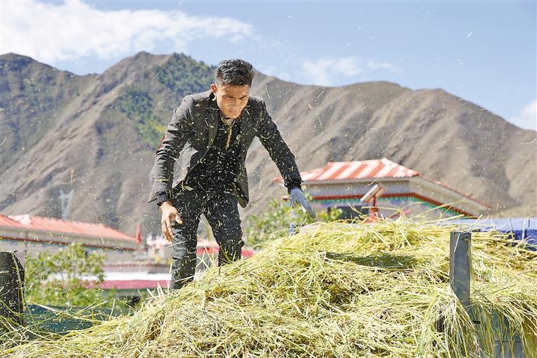 村民將收獲的水稻裝車?!∮浾?卓瑪七林 攝