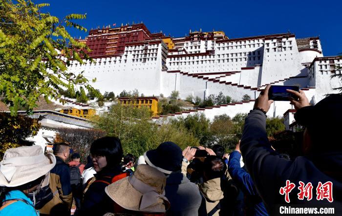 圖為11月1日,游客在布達(dá)拉宮德央夏廣場(chǎng)拍照。中新社記者 李林 攝