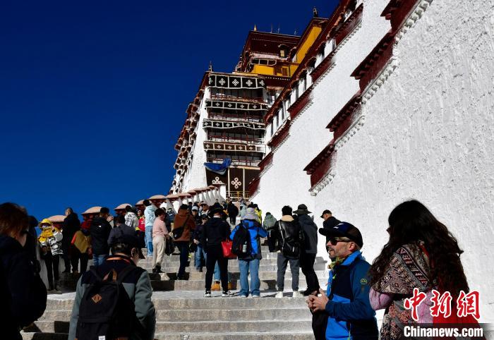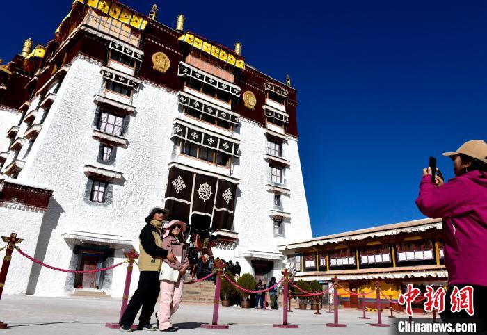 隨著2024冬游西藏的啟動(dòng),西藏所有A級(jí)景區(qū)(寺廟景區(qū)除外)免費(fèi)游覽,布達(dá)拉宮也成為冬游西藏?zé)衢T游覽地之一。圖為11月1日,來(lái)自四川的信眾在布達(dá)拉宮拍照留念。中新社記者 李林 攝
