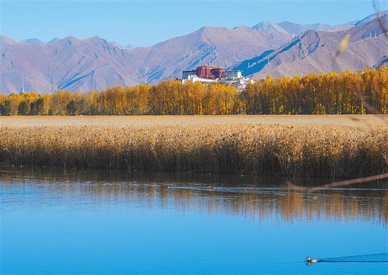 立冬時節(jié),被稱為“拉薩之肺”的拉薩市拉魯濕地國家級自然保護區(qū)景色依舊。草木盡染,水天相映,與遠處的城市建筑共同構成一幅美麗的生態(tài)畫卷。拉魯濕地是世界上海拔最高、面積最大的城市天然濕地,是拉薩市氧氣的主要補給源。