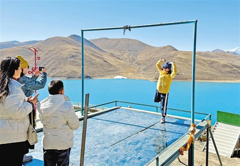 圖為游客在羊卓雍錯拍照留念。記者 旦增蘭澤 攝