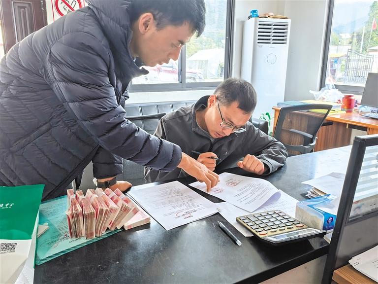 墨脫縣新創(chuàng)農(nóng)業(yè)科技開發(fā)公司工作人員為波東村種植戶結(jié)算靈芝款。