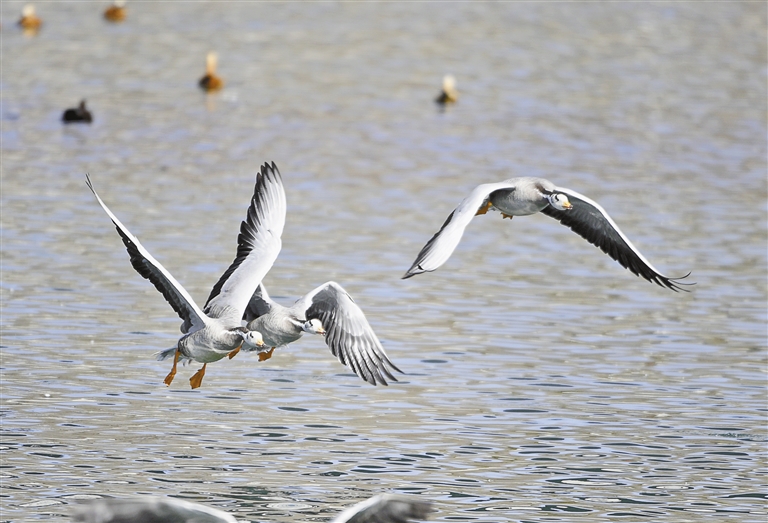 圖為在拉薩河上飛翔的候鳥。記者 唐斌 攝
