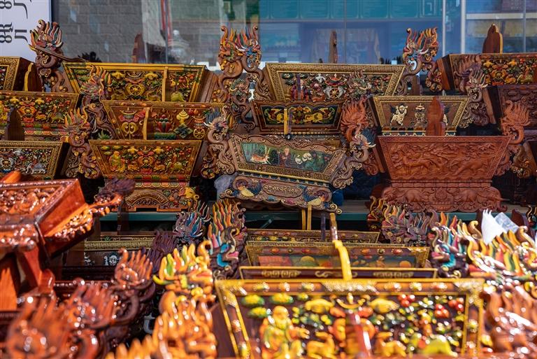 “老板,這個切瑪盒多少錢?便宜點我就拿走了?!薄斑@個圖案樣式都是精心雕刻的,最低1300元,實在不能再少了?!贝稳实牡赇伹?,不少顧客正在挑選“切瑪盒”,生意很是火爆。“切瑪盒”是將精制斗形木盒用隔板分開,左右兩邊分別盛入炒青稞和糌粑,再插上象征五谷豐登的“羅薩梅朵”和寓意吉祥的酥油花,寓意人壽年豐、吉祥如意,是藏歷新年家家戶戶必備的年貨之一。次仁告訴記者,“切瑪盒”根據(jù)圖案、顏料、大小、木材等因素,售價從幾百元到上千元不等,很多顧客普遍喜愛傳統(tǒng)樣式與圖案。