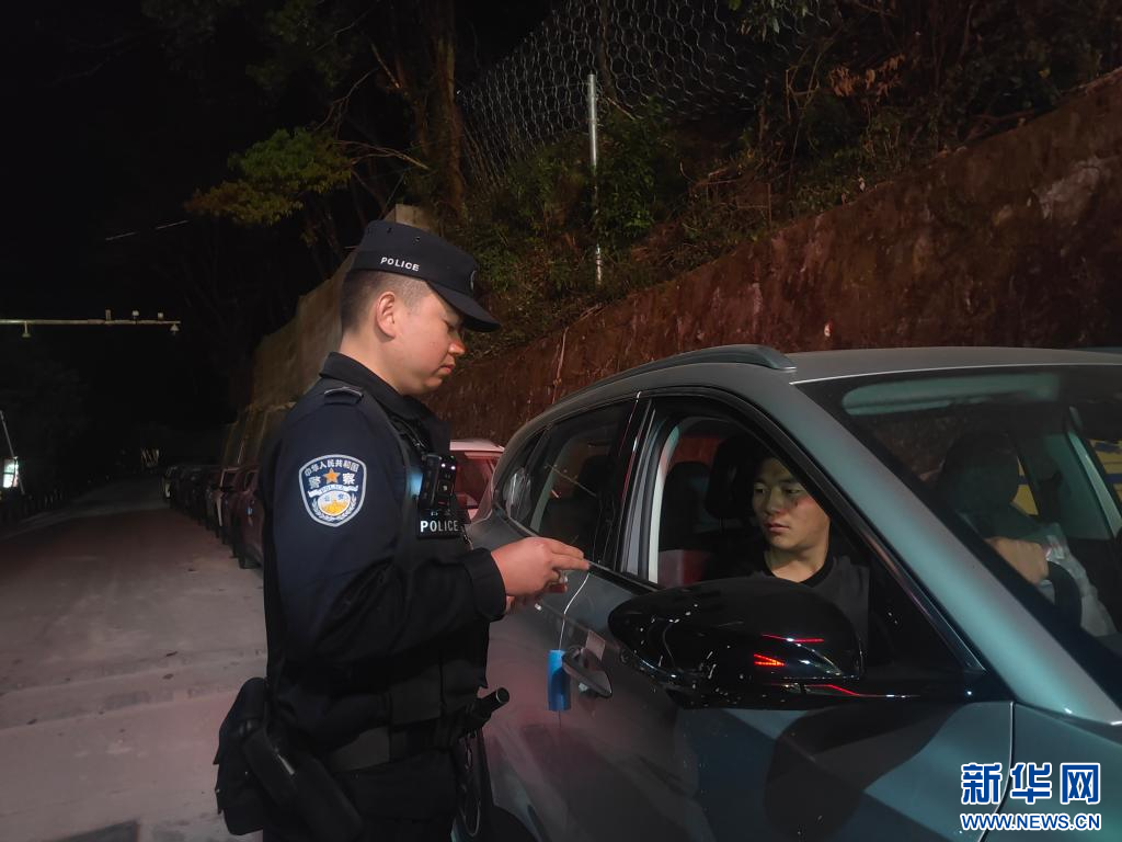 這是民警夜間指導待出口新能源汽車輛??靠诎额A檢預放車位。(新華社發(fā) 洛追次仁 攝)