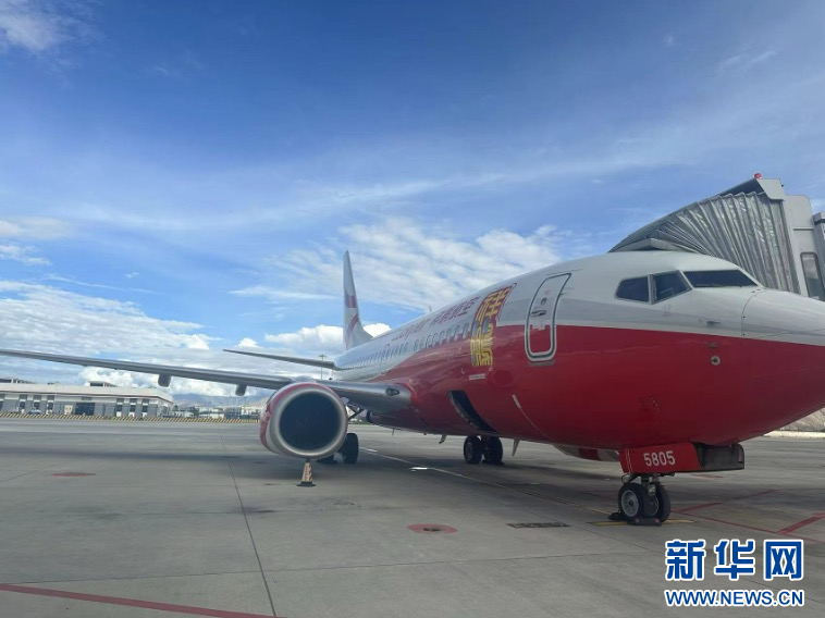 這是3月30日拍攝的停在拉薩貢嘎國際機(jī)場的8L9511航班。(祥鵬航空供圖)