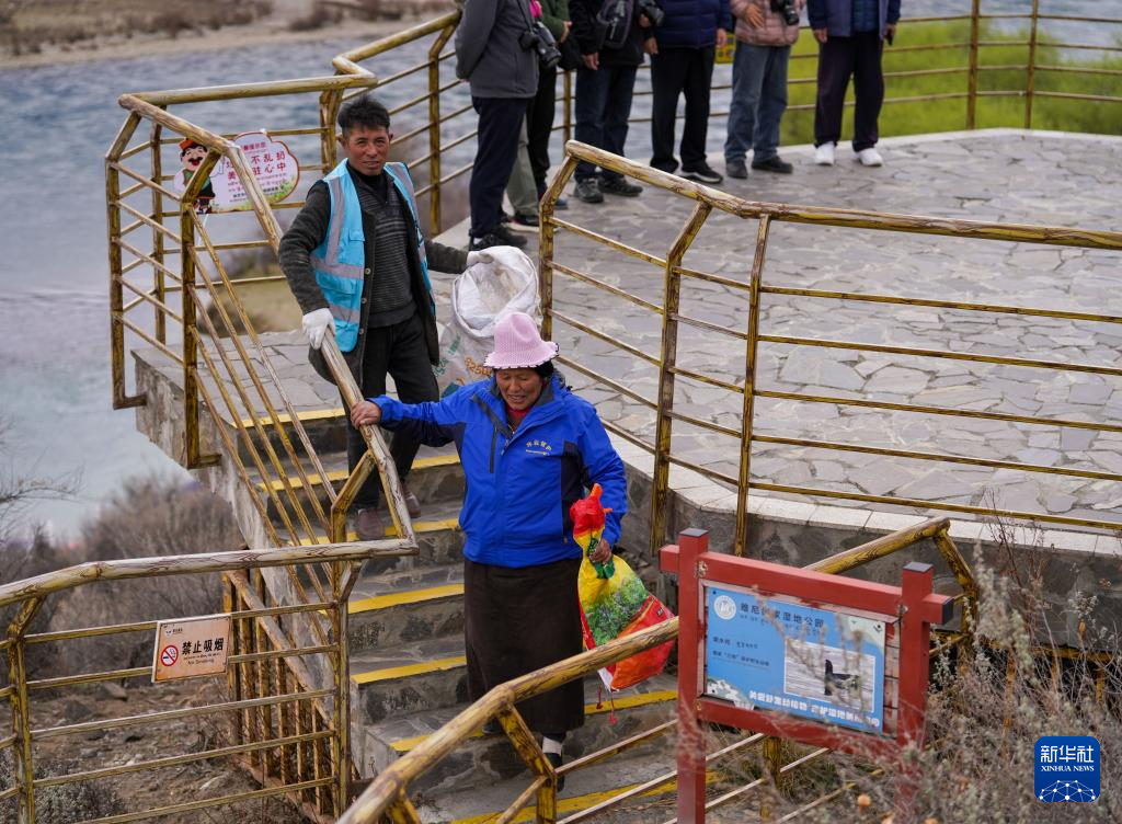 4月4日,雅尼國家濕地公園管護員在巡護途中清理垃圾。新華社記者 丁增尼達 攝?
