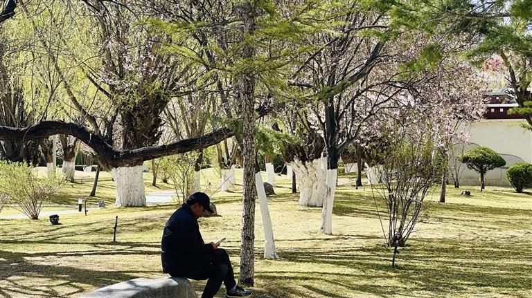 在拉薩,賞花從不必刻意尋找景區(qū),許多街道便藏著盎然春色。四月的拉薩城西,也有著令人目不暇接的美好。八一路、羅堆西路、羅布林卡路一帶,除了常見的榆葉梅、紫葉李等,還藏著拉薩不常見的海棠花,此時(shí)的海棠花在綠葉的襯托下開得正艷。陽(yáng)光灑下,花朵和葉子的顏色飽和度極高,微風(fēng)拂過(guò),花瓣輕柔飄落,不少路人紛紛停下拍照,將明艷的春色收進(jìn)自己的手機(jī)。