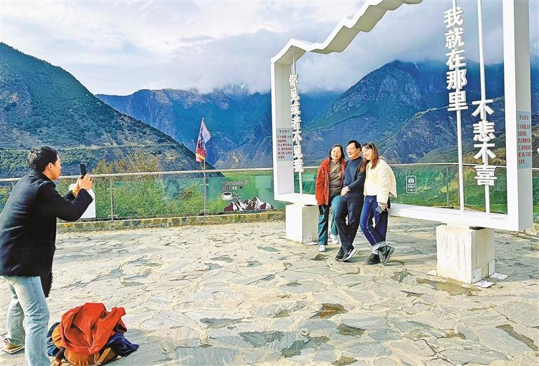 游客在雅魯藏布江大拐彎觀景臺拍照留念。記者 白瑪澤旺 攝