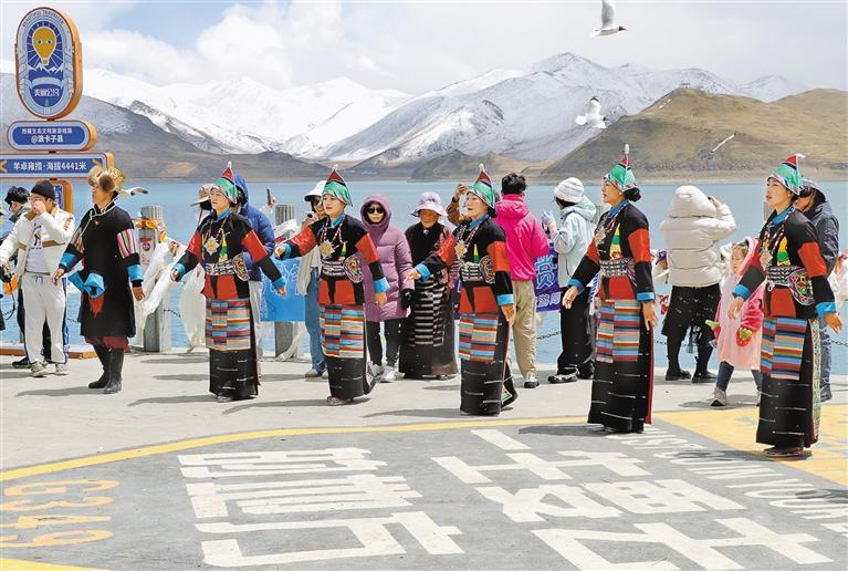 游客在羊卓雍錯(cuò)景區(qū)欣賞特色民族歌舞表演。記者 丹增平措 攝