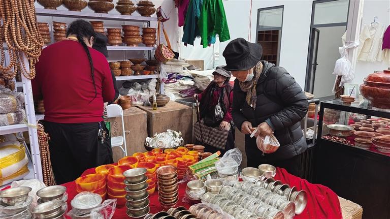 參展商們也在最后一天全力沖刺,來自不同地域、經(jīng)營不同品類商品的商家在展會上均收獲頗豐。來自尼泊爾的新白瑪塔西綜合商店老板拉魯,此次展銷會帶來了木碗、玉碗、銅碗等二十多類特色產(chǎn)品。他笑著表示:“銷量挺不錯的,我們家的產(chǎn)品不僅品類豐富,價格也實(shí)惠。這已經(jīng)是我第八次來拉薩參加展銷會了,每次都能感受到拉薩消費(fèi)者的熱情,也收獲滿滿?!?/p>