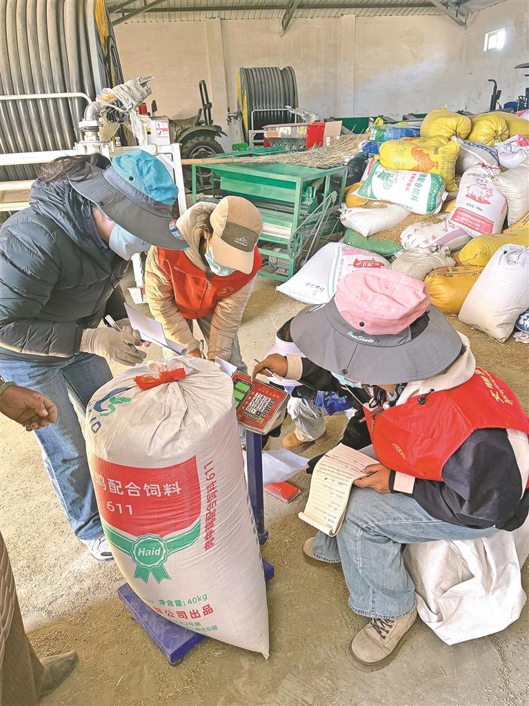 這些“尖兵”一邊當(dāng)起產(chǎn)量計量員,拉著專業(yè)秤具挨家挨戶跑。在糧倉門口,新時代文明志愿者赤列平措蹲在地上調(diào)秤,搭檔德吉拉珍拿著本子記錄,每袋青稞都要稱兩遍才下筆?!斑@可是農(nóng)戶一年的血汗錢,半點不能馬虎?!背嗔衅酱氩林~頭的汗說,他們針對獨居老人、缺勞力家庭開展上門服務(wù),光仁增倫珠家就精準(zhǔn)計量了1806.6斤青稞,還幫老人把數(shù)字清清楚楚記在掛在墻上的賬本里。