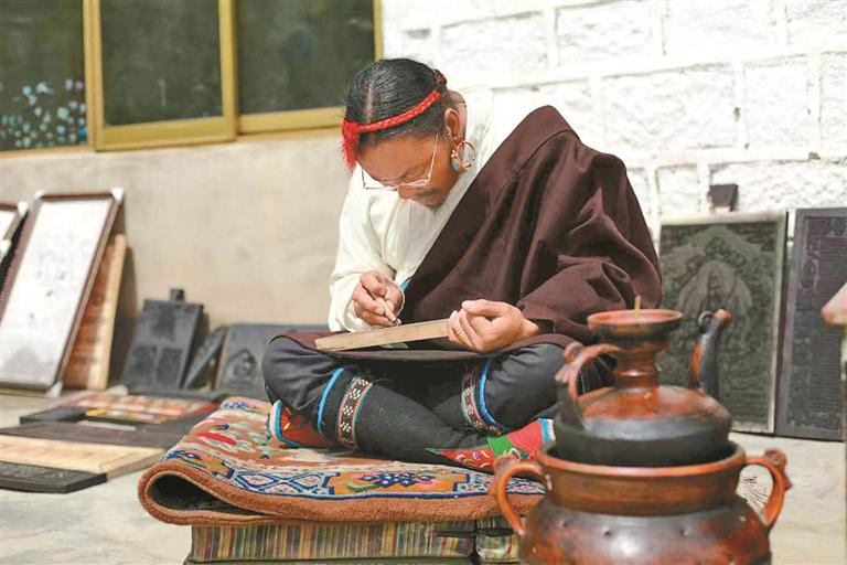 在傳承技藝的過(guò)程中,斯曲也面臨著不少挑戰(zhàn)。教徒弟時(shí)最大的困難就是讓他們靜下心來(lái),因?yàn)檫@門手藝需要從小學(xué)起,不僅要學(xué)習(xí)拿工具,還要學(xué)習(xí)認(rèn)字和雕刻。“以前光是學(xué)習(xí)雕刻文字,起碼要9個(gè)月時(shí)間,現(xiàn)在的孩子都很聰明,兩年基本就能掌握雕刻技藝?!彼骨牢康卣f(shuō)。