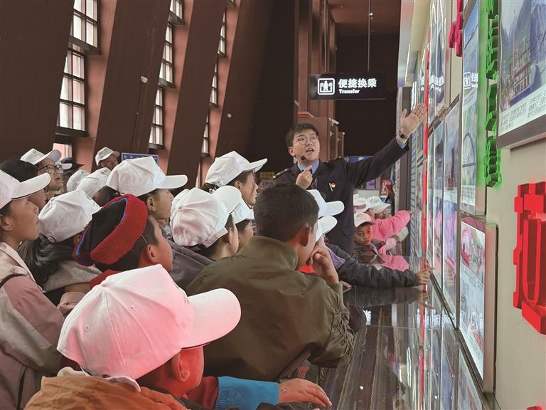 “這條全長435.48公里的鐵路,橋隧比高達75%,結(jié)束了藏東南地區(qū)不通鐵路的歷史!”隨著工作人員的講解,同學(xué)們的目光追隨著沙盤上的鐵軌延伸,理解了這條鐵路修建的困難程度,更讀懂了這條鐵路對“加強聯(lián)系交流、維護民族團結(jié)”的重要意義。