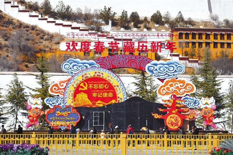 春節(jié)、藏歷新年臨近,我區(qū)各市(地)街頭巷尾處處洋溢著濃郁的節(jié)日氣氛。 圖為2月10日,布達拉宮廣場節(jié)日景觀花雕。 記者 李洲 攝