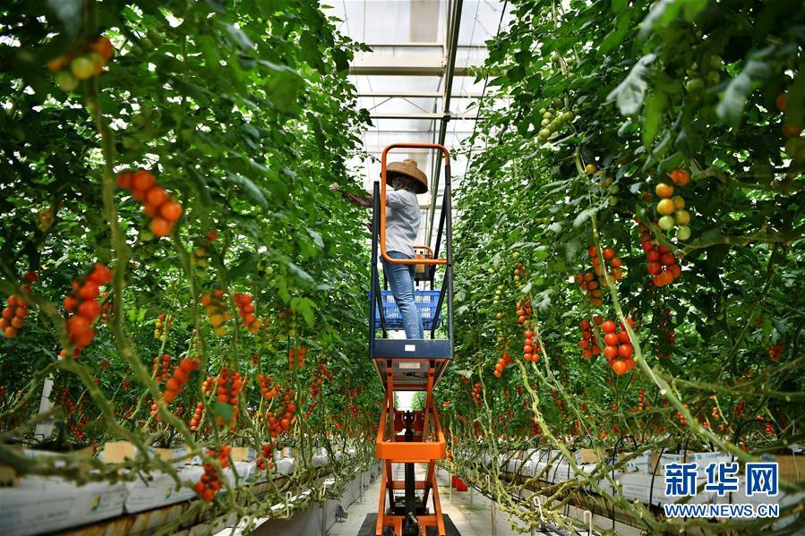 在陵水現(xiàn)代農(nóng)業(yè)示范基地,工人在管理通過(guò)擱架吊蔓式栽培技術(shù)種植的詹妮瑞番茄(3月26日攝)。在海南省陵水現(xiàn)代農(nóng)業(yè)示范基地,無(wú)土栽培技術(shù)、計(jì)算機(jī)自動(dòng)化控制系統(tǒng)、立體垂直旋轉(zhuǎn)栽培、有機(jī)循環(huán)利用等多種科技元素聚集在一起。農(nóng)業(yè)工廠化的運(yùn)作模式,讓大棚里的瓜菜產(chǎn)量較傳統(tǒng)種植翻了幾番,農(nóng)民收入也大幅提高。新華社記者 郭程 攝