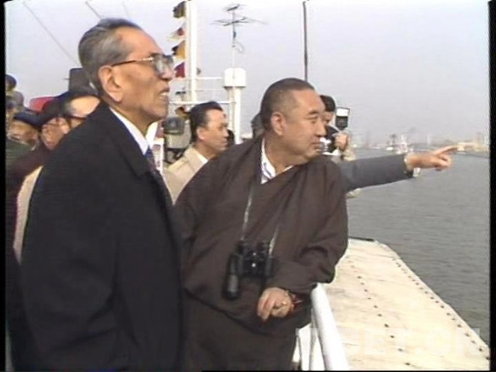 圖為1987年4月19日,十世班禪大師和阿沛o阿旺晉美率領援助西藏發(fā)展基金會籌備委員會委員考察天津港。