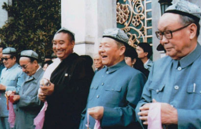 圖為習仲勛(右二)與烏蘭夫(右一)、十世班禪(右三)、賽福鼎o艾則孜(右四)、楊靜仁(右五)在北京民族文化宮。圖片來源:《中國西藏》雜志