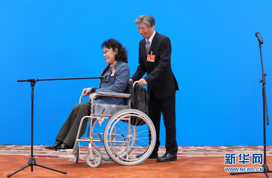 3月4日,全國(guó)政協(xié)十三屆四次會(huì)議第一場(chǎng)“委員通道”采訪活動(dòng)在北京人民大會(huì)堂新聞發(fā)布廳舉行。這是采訪活動(dòng)結(jié)束后,全國(guó)政協(xié)委員范迪安推著全國(guó)政協(xié)委員張海迪離開會(huì)場(chǎng)。新華社記者 李賀 攝