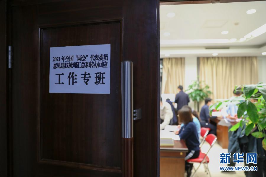 3月5日,2021年全國兩會代表委員意見建議梳理匯總和轉(zhuǎn)辦回應工作專班的工作人員在忙碌。新華社記者 李木子 攝