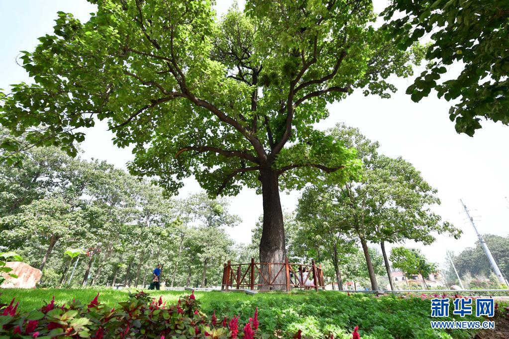 在河南蘭考縣焦裕祿干部學(xué)院門(mén)口,游客從“焦桐”下走過(guò)(2017年8月9日攝)。新華社記者 馮大鵬 攝