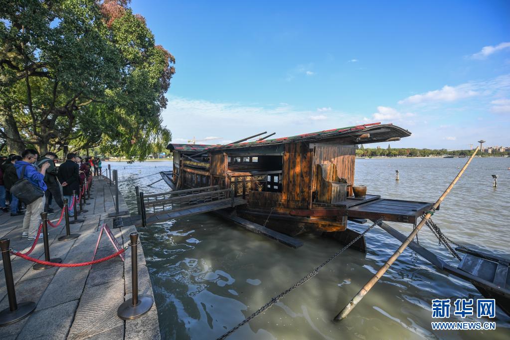 停靠在浙江嘉興南湖湖心島的南湖紅船(2020年10月27日攝)。新華社記者 徐昱 攝
