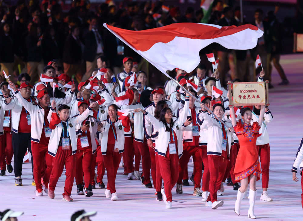 7月28日,印度尼西亞大學(xué)生體育代表團(tuán)在開幕式上入場(chǎng)。新華社記者 張麗蕓 攝