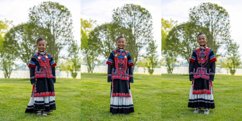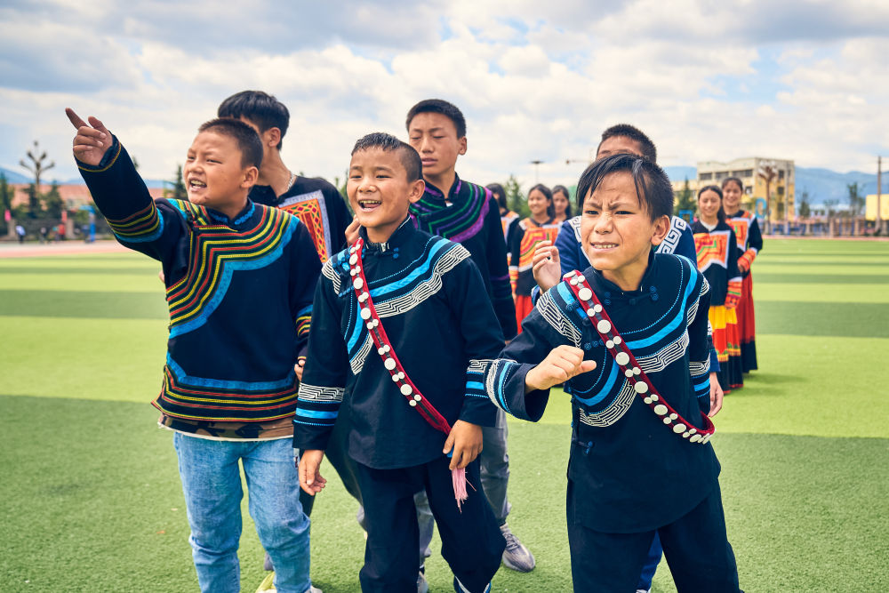7月2日,在昭覺縣萬達(dá)融創(chuàng)紅絲帶愛心學(xué)校參與排練的俄地惹漢(前左)、馬杰英(前中)和吉合拉作(前右)。(受訪者供圖)