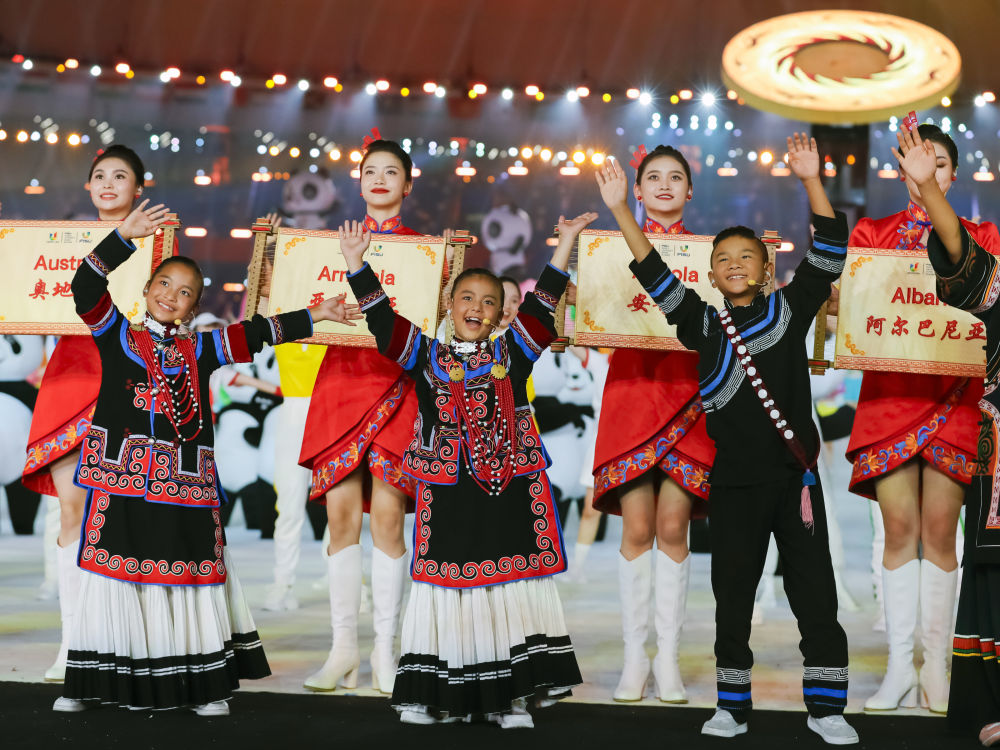 7月28日,來自四川涼山彝族自治州的孩子們在成都大運(yùn)會開幕式上歌唱。新華社記者 江宏景 攝