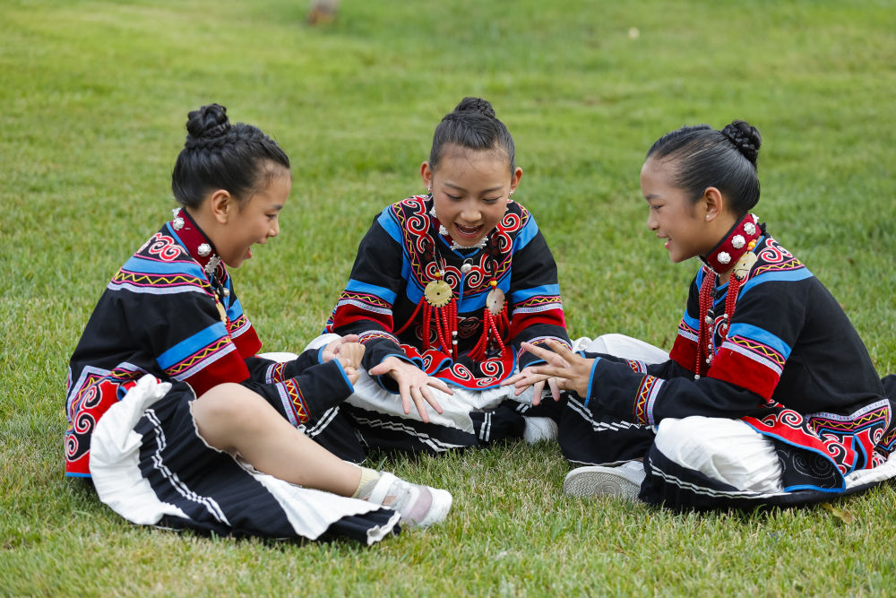 7月23日,在成都大運(yùn)會開幕式彩排之前,馬杰英、吉合拉作和俄地惹漢(從左至右)坐在草地上玩游戲。新華社記者沈伯韓 攝