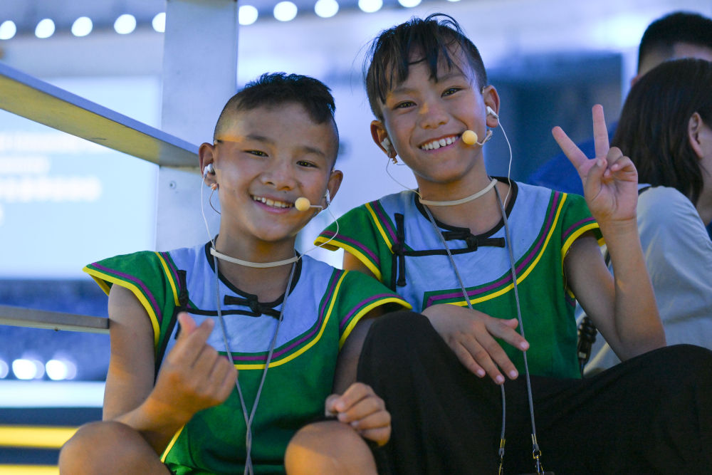 7月16日,在成都大運(yùn)會開幕式彩排現(xiàn)場拍攝的候場中的吉子醫(yī)生(左)和吉朵史拉(右)。新華社記者胥冰潔 攝
