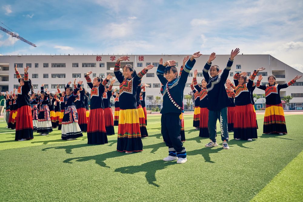7月2日,昭覺縣萬達(dá)融創(chuàng)紅絲帶愛心學(xué)校晨曦藝術(shù)團(tuán)成員在學(xué)校排練,右四為吉朵史拉。(受訪者供圖)