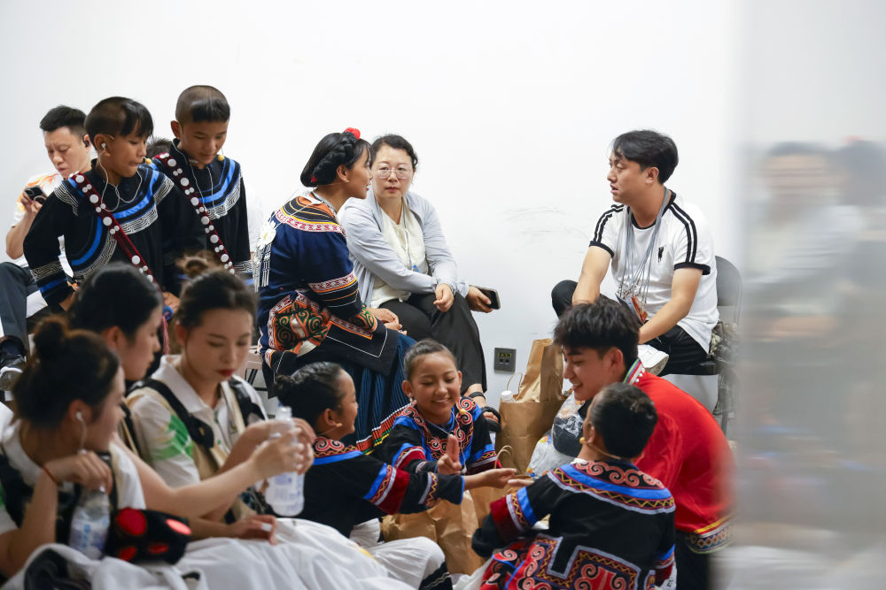 7月23日,在成都大運(yùn)會開幕式彩排開始前,來自涼山州的孩子們在和他們的老師聊天。新華社記者沈伯韓 攝