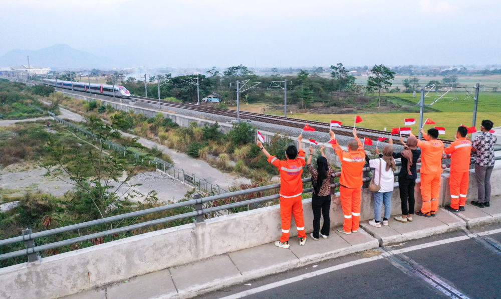 10月17日,在印度尼西亞萬隆一座天橋上,雅萬高鐵建設單位之一中鐵電氣化局的中國和印尼籍員工揮舞著中國和印尼兩國國旗,向遠處駛來的一列雅萬高鐵高速動車組列車歡呼(無人機照片)。新華社記者 徐欽 攝