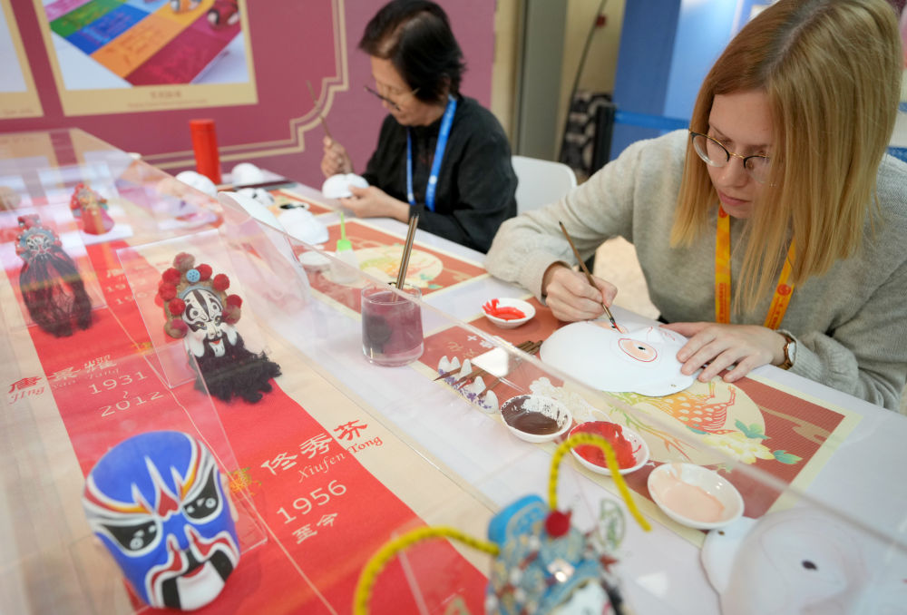 10月16日,在第三屆“一帶一路”國(guó)際合作高峰論壇新聞中心,來自比利時(shí)的記者(右)體驗(yàn)畫京劇臉譜。新華社記者 王毓國(guó) 攝
